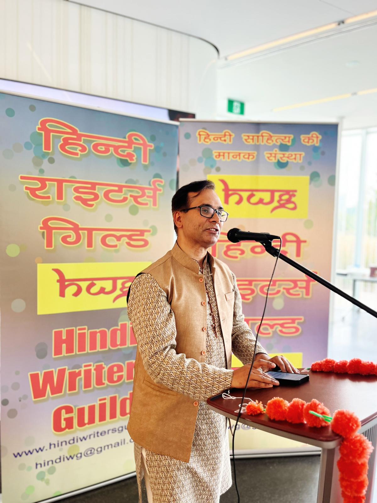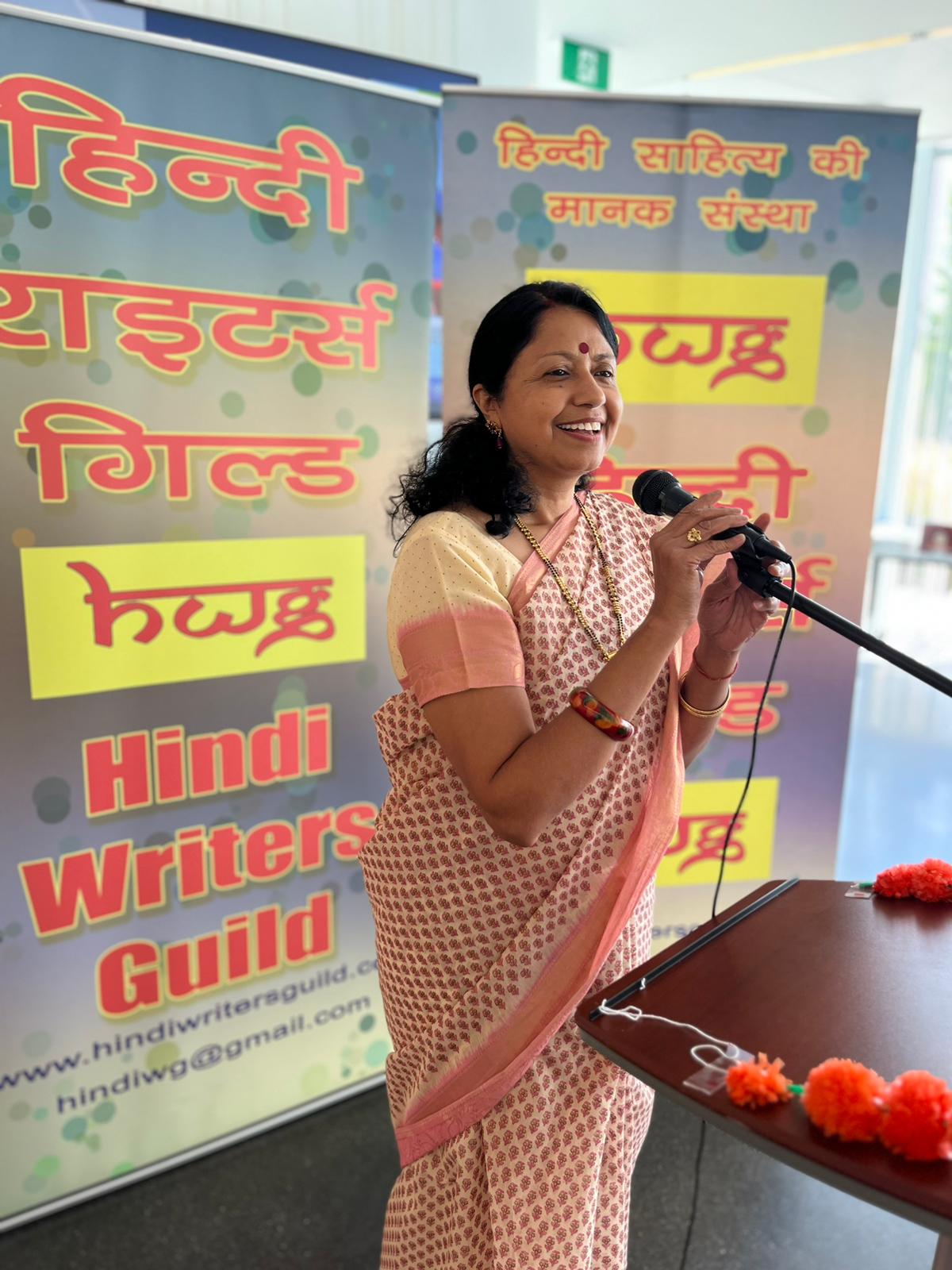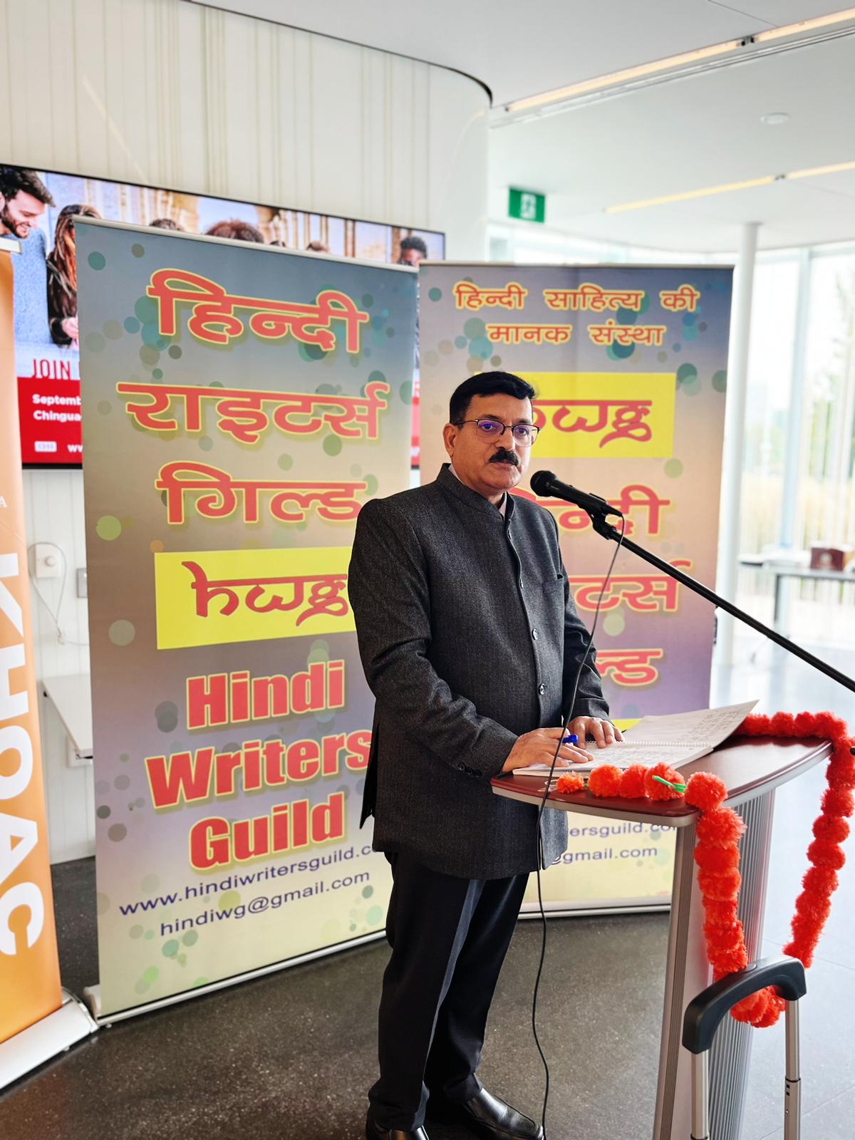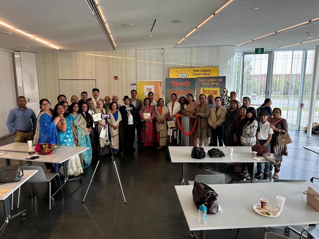 शनिवार दिनांक 16 सितम्बर, 2023 को ब्रैम्पटन की चिंकूज़ी लाइब्रेरी में हिन्दी राइटर्स गिल्ड ने टोरोंटो स्थित भारतीय काउंसलावास के सहयोग से हिन्दी दिवस का आयोजन किया। कार्यक्रम को दो सत्रों में रखा गया। पहले सत्र में परिचर्चा जिसका विषय था "कोरोनाकाल की चुनौतियों को संभावनाओं में बदलती हिन्दी" तथा दूसरे सत्र में कैनेडा में हिन्दी के प्रचार-प्रसार से जुड़े कर्मठ सहयोगियों को काउंसलावास द्वारा सम्मान की प्राप्ति। गिल्ड की प्रबंधन समिति के सदस्य श्री योगेश ममगाईं जी ने सभागार में उपस्थित सभी का स्वागत अभिनन्दन करते हुए पहले सत्र के संचालन की कमान संभाली। सर्वप्रथम टोरोंटो की प्रसिद्ध गायिका और साहित्यकार मानोशी चटर्जी को सादर आमंत्रित किया। परम्परा के अनुसार गोष्ठी का शुभारंभ मानोशी चटर्जी के सुमधुर स्वर में सरस्वती वंदना से हुआ। तदुपरांत ममगाईं जी ने आज की चर्चा में भाग ले रहे सहभागियों में से सबसे पहले श्रीमती आशा बर्मन जी को सादर आमंत्रित किया। आशा बर्मन जी ने उपरोक्त विषय पर अपने विचार साझा करते हुए कहा- 'करोनाकाल में एक ओर जीवन की गतिविधियाँ सीमित हो गई थीं पर साथ ही साथ ऐसे कठिन समय में यह आशीर्वाद के रूप में हमें मिला ज़ूम तथा गूगल मीट आदि जिसके द्वारा हम घर में भी रहकर सारे विश्व से कई देशों के हिंदी के विद्वानों से जुड़ सके। ब्लेसिंग इन डिसगाइज। मेरा सौभाग्य रहा है कि मैं इस हिंदी वैश्विक परिवार के साथ जुड़ी हूँ। इस करोना काल में हिंदी राइटर्स गिल्ड कैनेडा ने आभासी मंच पर कई कवि गोष्ठियाँ कीं। अंत में मैं यह कहना चाहूँगी कि सचमुच ही करोना की चुनौतियों में हिंदी भाषा पहले से कहीं अधिक समर्थ हुई है और विदेशों में रहने वाले हिंदी के लेखकों की स्थिति भारतवर्ष में भी सम्मानित हुई है। उन्हें फिजी में सम्मान दिया गया है जैसे शैलजा जी को। यहाँ के लेखकों पर शोध हो रहे हैं यह गर्व की बात है। हमारी हिंदी नि: संदेह हर प्रकार से ही करोनाकाल के समय आभासी मंचों के द्वारा पहले से अधिक समृद्ध हुई है।' गिल्ड की सह संस्थापिका निर्देशिका श्रीमती शैलजा सक्सेना जी ने अपने वक्तव्य में स्पष्ट किया कि संभावना जब तक यथार्थ नहीं बनती तब तक उसमें चुनौती छिपी रहती है तो हर एक व्यक्ति को संस्थाओं और सरकारों से ही सदा अपेक्षा करते रहने के स्थान पर अपने भीतर, अपने क्षेत्र और राज्य के भीतर हिंदी के उपयोग और प्रयोग की, प्रसार और प्रचार की संभावनाओं को देखना चाहिए चाहें वे भारतीय रेस्टोरेंट के मेन्यू कार्ड पर अंग्रेज़ी के साथ हिन्दी लेख के लिए हो या सरकारी पत्रों के हिन्दी अनुवाद के लिए हो.. ऐसे अवसर ढूँढने चाहिए जहाँ हिन्दी का प्रयोग बढ़ सके। गिल्ड के सह संस्थापक निर्देशक श्री सुमन कुमार घई जी 