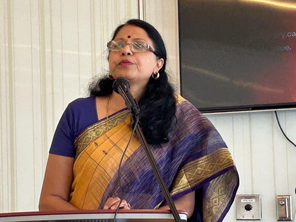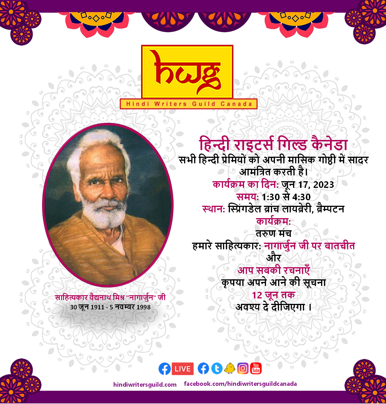 हिन्दी राइटर्स गिल्ड कैनेडा की मासिक गोष्ठियों का क्रम कोरोना के बाद लगातार जारी है। हर माह के तीसरे शनिवार दोपहर १:३० से ४:३० तक ब्रैम्पटन शहर की स्प्रिंगडेल लाइब्रेरी में हिन्दी प्रेमी और हिन्दी के लेखक समय निकाल कर मिलते हैं, अपनी रचनाएँ पढ़ने के साथ-साथ किसी एक प्रतिष्ठित लेखक, उनके व्यक्तित्व और कृतित्व पर भी बात करते हैं। इस क्रम में पं. भवानी प्रसाद मिश्र, श्री सुमित्रानंदन पंत पर बात करने के बाद कल बाबा नागार्जुन जी को याद किया गया। इस माह के तीसरे शनिवार यानी जून 17 2023 की गोष्ठी में कुछ पुराने और कुछ नए सदस्यों के बीच एक सुखद रचनात्मक दोपहर बीती। उसी दिन शाम गिल्ड की सदस्या मानोशी चैटर्जी का संगीत का कार्यक्रम होने से कुछ सदस्य कम आए थे तो प्रारंभ में लगा कि आज आत्मीय गोष्ठी में बातचीत और देर तक सुनाने का क्रम होने वाला है पर फिर लोग आते गए और कारवाँ बनता गया। कुछ नए लोग और कुछ पहचाने चेहरे… पर कार्यक्रम में पहली बार आने वाले लोगों ने मन को मिलन की सुखद अनुभूति से भर दिया। नए में सुषमा जी, आकृति अग्रवाल जी, अंकित अग्रवाल जी, गुरप्रीत बटालवी जी और पहचाने चेहरों में पहली बार आने वाले संस्कृत भारती के प्रमुख और संस्कृत के प्रतिष्ठित प्राध्यापक हर्ष ठक्कर जी, उनकी पत्नी दिशा और भारत से आईं, हिन्दी/ संस्कृत प्राध्यापिका/ लेखिका और दिशा जी की माता जी, उषा हिरानी जी तथा बहुत समय बाद आने वालों में सुरेश पांडे जी, उनकी पत्नी माया जी और भारत में इतिहास के प्रोफ़ेसर माया जी के पिता जी थे। हमारे सदस्यों में नए जुड़े अनुज शर्मा जी मिठाई के कई डिब्बों के साथ-साथ सुन्दर कविता और गीत लाए थे, बंदिता सिन्हा जी और उनके पति अनिल जी ने बेटी के डॉक्टरी में एम.डी. सर्वोच्च अंकों से उत्तीर्ण करने की प्रसन्नता में घर में बनाए लिट्टी, चने, रसगुल्लों और चाय के साथ सबके बीच पर्व सी मिठास घोली और बंदिता जी ने अपनी विशिष्ट शैली में दो रचनाएँ सुनाईं। संस्था के वरिष्ठ संस्थापक निदेशक विक्रांत जी ने अपनी मौलिक रचना ’ख़ुदा के नाम चिठ्ठी’ और उस चिठ्ठी का जबाब सुनाया और नाइजीरिया के प्रवास का एक रोचक प्रसंग भी सुनाया। यहाँ सब को स्मरण कराते चलें कि जुलाई १५ को विक्रांत जी की ई-पुस्तक (प्रकाशक- www.pustakbazaar.com) “यादें ईरान की” का विमोचन है। संस्मरण की यह पुस्तक इस अर्थ में तो विशेष है ही कि ईरान पर इस तरह से लिखीं हिन्दी में बहुत पुस्तकें हमें नहीं मिलतीं पर इसके साथ ही यह इसलिए भी विशेष है कि संभवत: कैनेडा से प्रकाशित यह पहली संस्मरण पुस्तक है। इस गोष्ठी में श्रीमती कांता विक्रांत जी की उपस्थिति बहुत दिनों बाद हुई थी। नई सदस्या सुषमा जी ने एक बाल कविता सुनाई। पूनम चंद्रा ’मनु’ जी, निर्मल जसवाल राणा जी, डॉ. शैलजा सक्सेना, उ